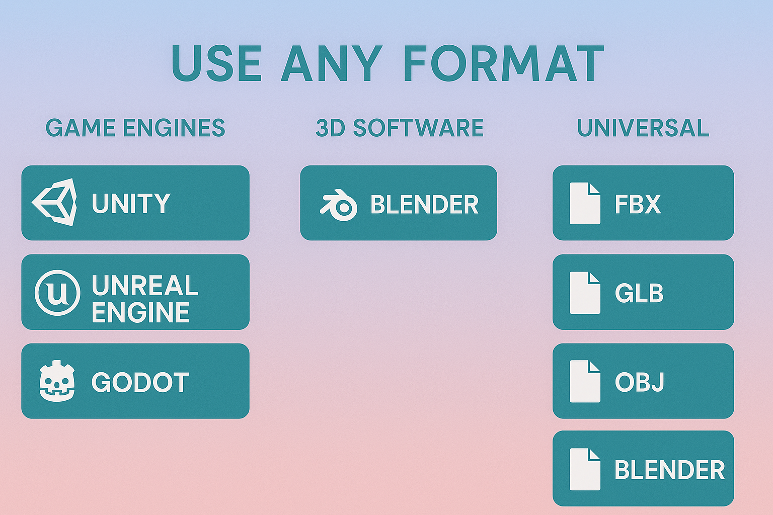 You’ll be able to download a Zip File that contains Every file Format as for Unity,UnrealEngine,Godot and separated .obj , .blender, .glb, .Fbx